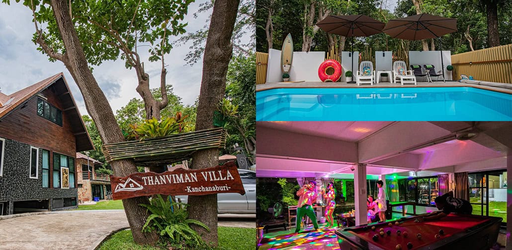 ธารวิมาน ที่พัก พูลวิลล่า ริมน้ำ เป็นอีกหนึ่งจุดหมายที่เหมาะสำหรับผู้ที่ชื่นชอบธรรมชาติและความเป็นส่วนตัว ถูกออกแบบมาเพื่อการพักผ่อนคลายร้อนกับธรรมชาติรอบข้าง ซึ่งพูลวิลล่านี้ตั้งอยู่ที่กาญจนบุรี เดินทางประมาณ 2 ชั่วโมง ไม่ไกลจากกรุงเทพ ที่พักสามารถสนุกกับกิจกรรมได้หลายอย่างมากไม่ว่าจะเป็น ปั่นจักรยาน วิ่งออกกำลังรอบสวนยิ่งช่วงเช้าๆอากาศเย็นสบายมาก ภายในที่พักมี 4 ห้องนอน 4 ห้องน้ำ โฮมเธียเตอร์ คาราโอเกะ โต๊ะพูล ห้องครัว ห้องทานข้าว ลานจัดปาร์ตี้บาบีคิว ที่พักยังมีสระว่ายน้ำขนาดใหญ่กลางแจ้งรองรับได้หลายคน เข้าพักได้ถึง 12 ท่าน ที่พักใกล้สถานที่ท่องเที่ยวมากมาย อย่าง สะพานแม่น้ำแคว สวนสัตว์เปิดซาฟารีปาร์ค (กาญจนบุรี) น้ำตกเอราวัณ เขื่อนศรีนครินทร์ ร้อนนี้จะนี้ไปไหนพ้นกับ ธารวิมาน ที่พัก กาญจนบุรี เข้าไปดูรายละเอียดได้ที่ >> Thanviman Forest Pool Villa หรือโทร 098-946-3659