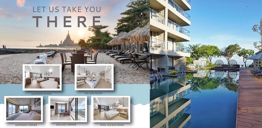 Golden Tulip Pattaya Beach Resort โรงแรมสี่ดาวทันสมัย ตั้งอยู่บนชายหาดส่วนตัว ได้รับขนานนามว่าเป็นปูซานประเทศไทย มีห้องหลายแบบทั้ง Family room with bunk bed พักได้ 4 ท่าน , Superior room , Deluxe room , Superior corner pool view , Superior corner sea view , Deluxe corner , Pool access บรรยากาศดี ดินเนอร์สุดแสนพิเศษ อาหารอร่อยริมทะเล มีเครื่องดื่มเย็นๆพร้อมชมพระอาทิตย์ตกดินก็สุดฟินจนหายร้อนไปเลย เก็บภาพประทับใจกับแสงแรกในยามเช้า คู่กับวิวทะเลและปราสาทสัจธรรม เป็นอีกหนึ่งประสบการณ์ที่ห้ามพลาดเมื่อมาพักที่นี่ เข้าไปดูรายละเอียดได้ที่ >> Golden Tulip Pattaya Beach Resort หรือโทร 038-199-390
