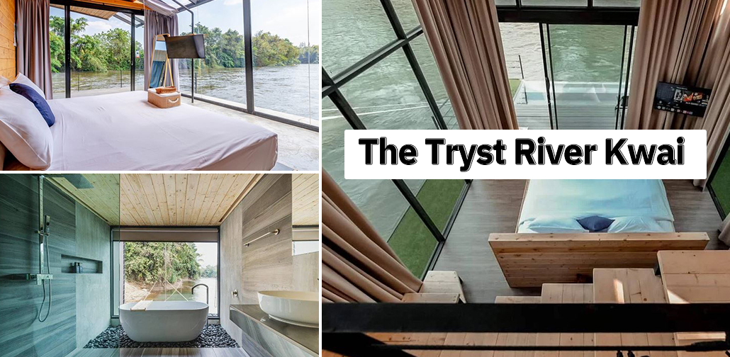 The Tryst River Kwai เป็นรีสอร์ทเล็กๆ สไตล์ Forest Loft อยู่ในที่ลับๆ ติดแม่น้ำแควน้อย ในส่วนของที่นี่ขอแนะนำห้อง “Panoramic River vibe” เป็นห้องแพริมแม่น้ำตั้งอยู่ทางด้านซ้ายและหันหน้าไปทางแม่น้ำ ทำให้มองเห็นวิวแม่น้ำแบบพาโนรามา 180 องศา พร้อมด้วยอ่างอาบน้ำและสระว่ายน้ำส่วนตัว ห้องพักมีขนาดกว้างขวางถึง 51 ตร.ม. สามารเข้าพักได้ 2-6 ท่าน