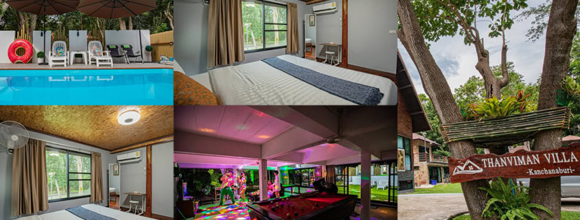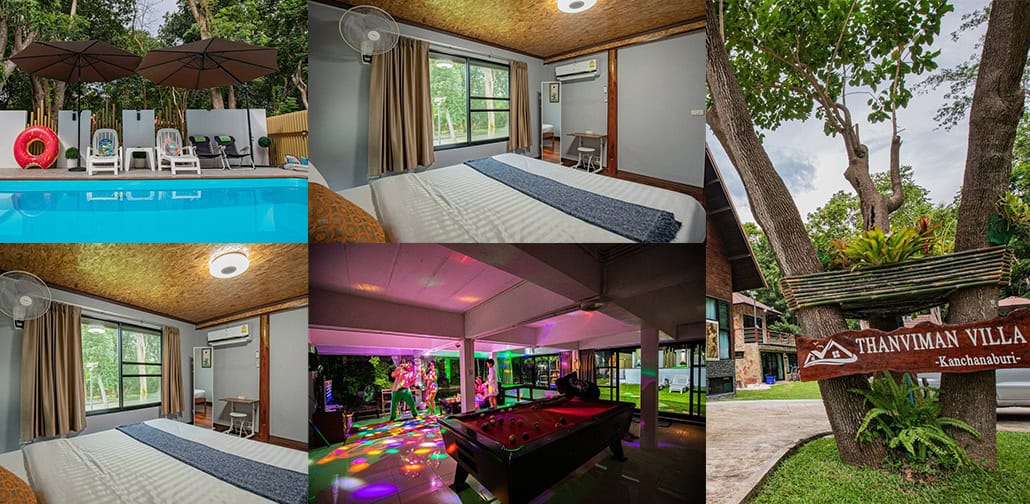 Thanviman Forest Pool Villa – ที่พัก ธารวิมาน พูลวิลล่า กาญจนบุรี ริมน้ำ และป่าไม้ร่ม เป็นที่แรกที่อยากแนะนำเลย เพราะที่พักหรูหรามากมีการออกแบบสไตร์หินกาบเย็นสบาย วิลล่ามีพื้นที่ใช้สอยกว่า 800 ตารางเมตร เหมาะสำหรับการพักผ่อนแบบครอบครัว สังสรรค์ในกลุ่ม เพื่อน บรรยากาศจะเป็นวิวป่า ต้นไม้สูง ภายในที่พักมีสิ่งอำนวยความสะดวกครบครัน มีบ้าน 2 หลัง หลังแรกมี 2 ห้องนอน 2 ห้องน้ำ 1 ห้องครัว มีห้องนั่งเล่นใหญ่ไว้ทานข้าว ต่อมาหลังที่ 2 มี 1 ห้องนอน 2 ห้องน้ำ ห้องกิจกรรมขนาดใหญ่ไม่ว่าจะเป็นโฮมเธียเตอร์ คาราโอเกะไว้ปาร์ตี้ โต๊ะพูล ไฮไลท์เด่นเลยมีสระว่ายน้ำกลางแจ้งขนาดใหญ่ ตอนกลางคืนนั่งชมดาวพร้อมเสียงนกร้องบรรยากาศดีสุดๆ ยามว่างสามารถเดินเล่นหรือวิ่งออกกำลังกายรอบที่พักได้ มีชิงช้านั่งเล่นใต้ต้นไม้ ที่นี่มีจักรยานไว้ปั่นกับเพื่อนด้วยนะ เข้าพักได้ 12 ท่าน