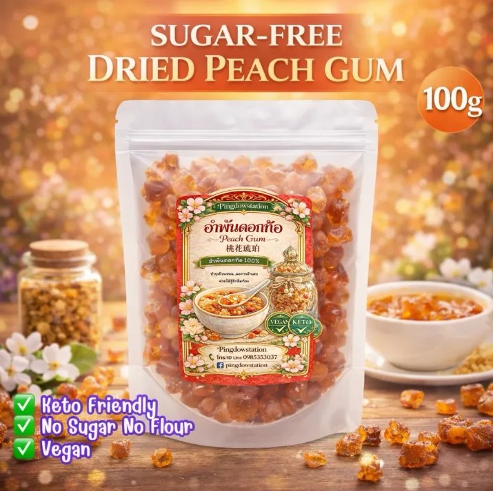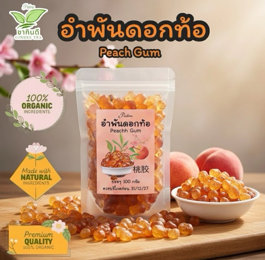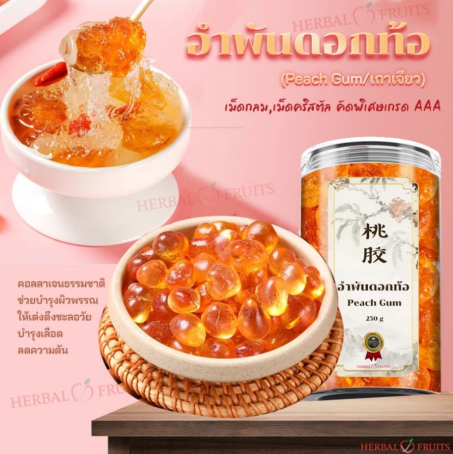 วัตถุดิบธรรมชาติที่ได้จากยางของต้นพีช ใสๆนุ่มหนึบ เคี้ยวเพลิน แถมยังให้ความรู้สึกเบาสบาย ไม่หนักท้อง นิยมนำไปต้มเป็นของหวาน ใส่พุทราจีน เก๋ากี้ หรือแปะก๊วย ยิ่งต้มยิ่งหอมละมุน ได้รสหวานธรรมชาติแบบพอดี