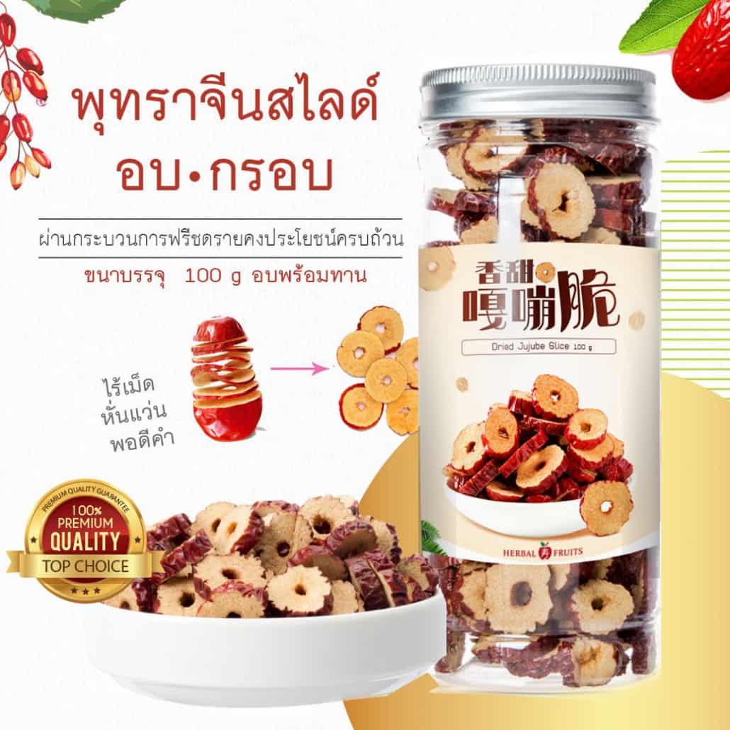 พุทราจีนอบกรอบของทาง Herbal Fruits เป็นสินค้านำเข้าจากประเทศไต้หวัน เป็นพุทราจีนพันธุ์ที่ได้รับการยืนยันจากทั่วโลกว่า หวาน หอม และ สามารถทานเปล่าๆได้เลย เป็นพุทราจีนพันธุ์ที่เม็ดโต รสชาติกรอบนอก นุ่มใน แตกต่างจากท้องตลาดทั่วไปที่มีรสขม ทั้งยังเป็นสินค้าขายดีในประเทศไต้หวันอีกด้วย กระบวนการการผลิตพุทราจีน นั้นได้รับการยืนยันว่า สะอาด และ คงประโยชน์ของพุทราจีนได้อย่างครบถ้วน นำมาหั่นแว่นอบกรอบ เพิ่มรสชาติในการรับประทานให้อร่อยกินเพลิน มีประโยชน์ต่อร่างกาย ไม่เพิ่มน้ำหนักไม่มีน้ำตาล