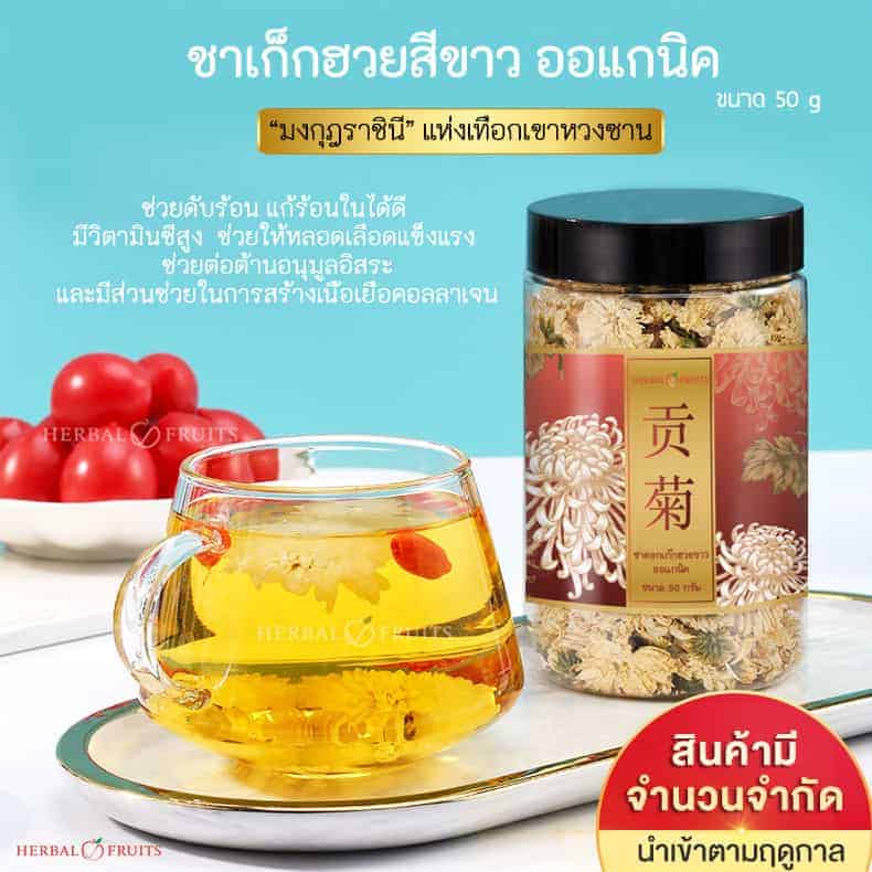 พูดถึงเรื่องเก็กฮวย จะนึกถึง Herbal Fruits เป็นอันดับแรกเลย เพราะเขาใส่ใจเรื่องสุขภาพมากๆ ผลิตภัฑณ์ทุกอย่างของเขาจะเกี่ยวกับชาหรือสมุนไพรที่ช่วยในการบำรุงร่างกายทั้งนั้นเลย ทำดื่มเองก็ง่าย เก๊กฮวยขาวตัวนี้เราแนะนำให้ทำแบบชงจะดื่มง่ายกว่าต้ม ถ้าต้มรสชาติจะออกขม ไม่ได้ขมมากขนาดดื่มไม่ได้ เพื่อสุขภาพเราทนได้อยู่แล้ว ถ้าจืดไปเราแนะนำให้ใส่น้ำตาลเพิ่มได้ตามที่เราชอบเลย (ส่วนตัวเราเป็นคนติดหวานจัด สำหรับคนอื่นรสชาติอร่อย กลมกล่อมแล้วไม่ต้องใส่น้ำตาลเพิ่ม) ชาเก็กฮวยทาง Herbal Fruits จะเป็นแบบกระปุก 1 กระปุกมีขนาด 50 กรัม จัดส่งฟรี ( จัดส่งทุกวันจันทร์ – ศุกร์ วันหยุดนักขัตฤกษ์ )