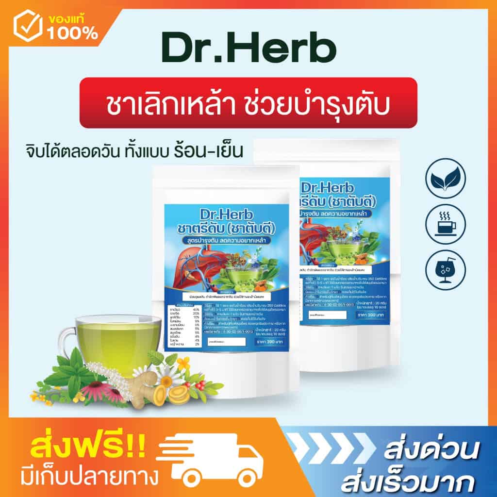 ชาชงสมุนไพร Dr.Herb ซึ่งสกัดจากสมุนไพรไทย 100% ทั้งหมด 11 ชนิด ได้แก่ ชาเขียว รางจืด ลูกใต้ใบ ใบหม่อน มะขามป้อม สมอพิเภก สมอไทย ขมิ้นชัน ใบเตย หญ้าหวาน ผลิตจากโรงงานมาตรฐานที่มีคุณหมอเป็นผู้ร่วมคิดค้นสูตรสมุนไพรบำรุงในเรื่องตับ ทั้งยังช่วยในการอยากเหล้าสำหรัผู้ที่มีอาการติดเหล้ามาก
